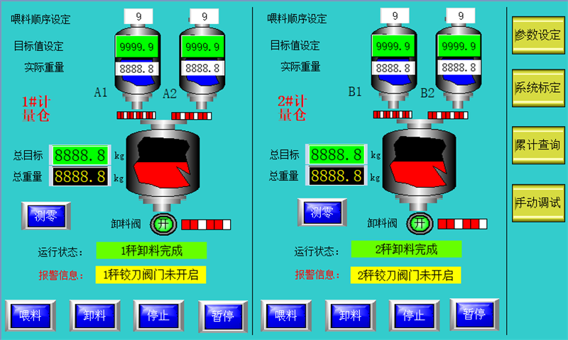 設(shè)置多個獨立儲料倉和多個獨立計量倉,對每種需要計量的物料預(yù)先按照各自配方進(jìn)行喂料控制(分為高速喂料和低速喂料、提前量控制)進(jìn)入計量倉內(nèi),等待生產(chǎn)需要時可以直接同步進(jìn)行卸料。